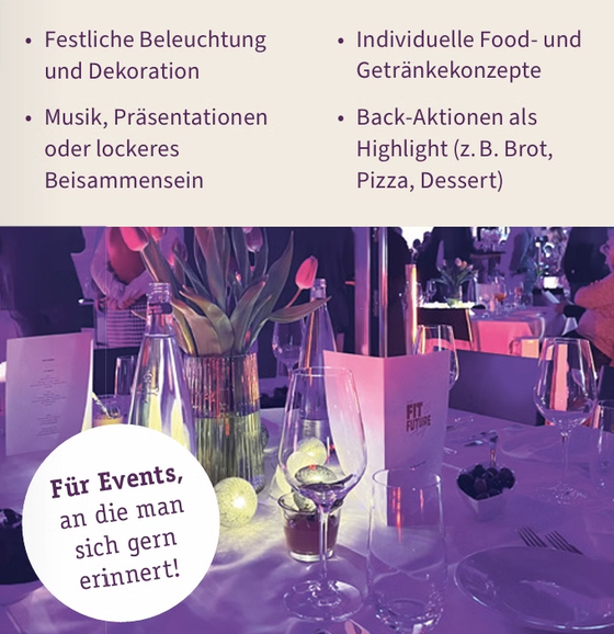 Ob Firmenfeier, Weihnachtsfeier oder Jubiläum - genießen Sie besondere Momente in einer Eventlocation, die mehr bietet als nur Raum: Stilvolle Gestaltung, persönliche Betreuung und das gewisse Etwas der gläsernen Backstube schaffen eine besondere Atmosphäre.