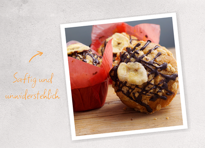 Mit unseren Produkten: Muffin Soft RSPO MB, Zimt, Fruchtpüree Banane, Dessertpaste Banane und Schokobella Vollmilch RSPO SG/RA MB cocoa